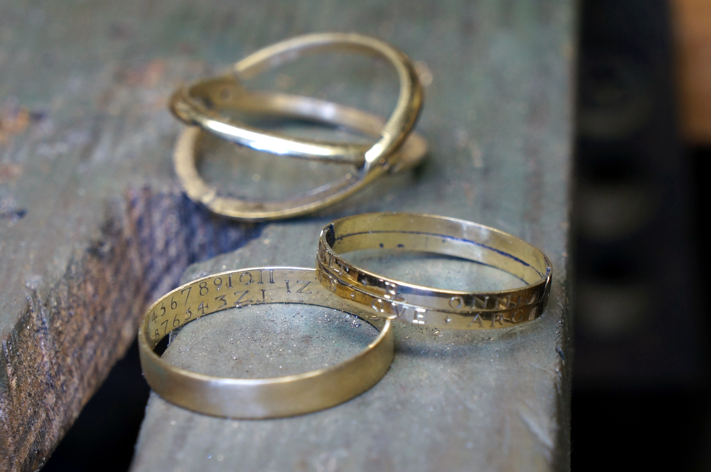 A reproduction of the famed armillary sphere ring in the collection of the Swedish History Museum in Stockholm. Originally created in Germany sometime in the 16th or 17th century, the ring is engraved with a vine motif on the outside, Proverbs 22:1 in French across several of its faces, the symbols of the zodiac & months of the year, and finally, an esoteric string of numbers. We have studied this ring meticulously & have done our best to faithfully capture its details.