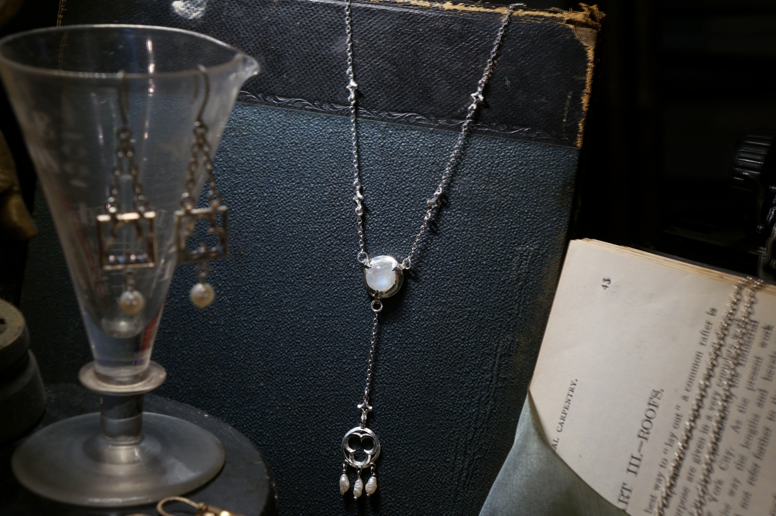 A flashy 10mm moonstone traditionally mounted in a medieval cusped setting, joined with gothic foliate elements and a round trefoil drop with three suspended pearls.