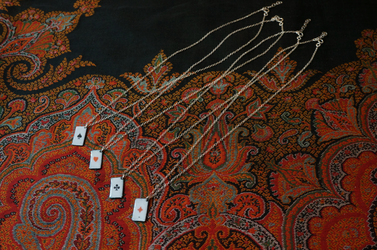 Hand-painted vitreous enamel playing cards, on a lightweight silver chain.