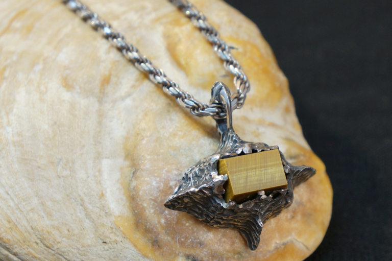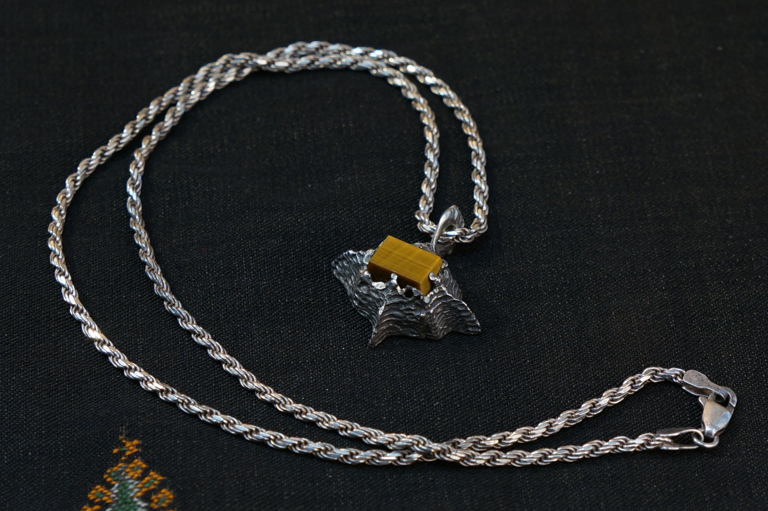 Inspired by hours of tabletop gaming, here's a grubby little monster guy in silver eating an angular vintage cut tiger's eye. He would stab you with his claw if it weren't so jealously wrapped around a vintage sterling silver chain.